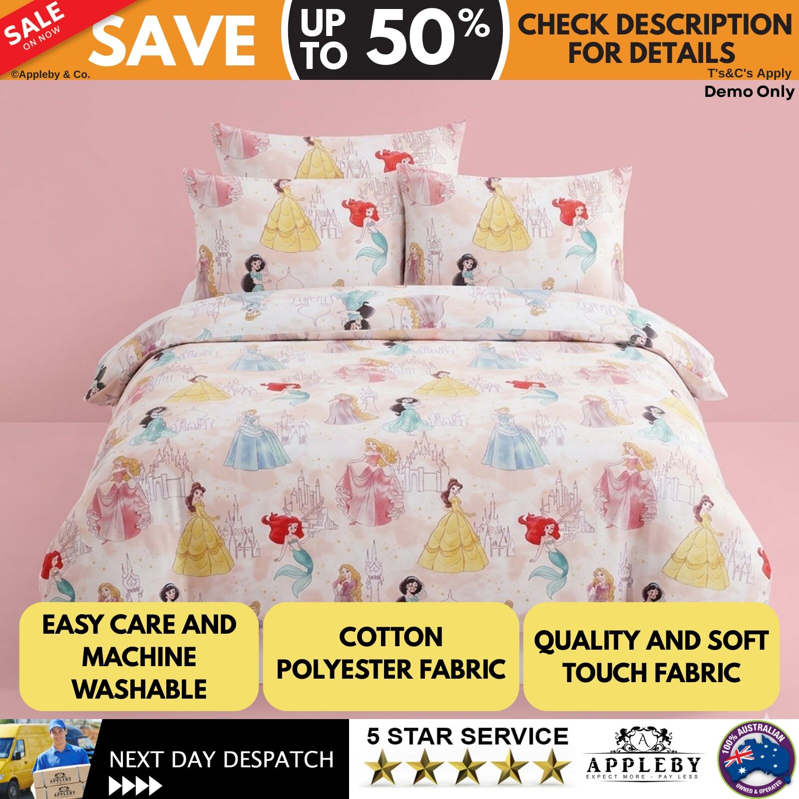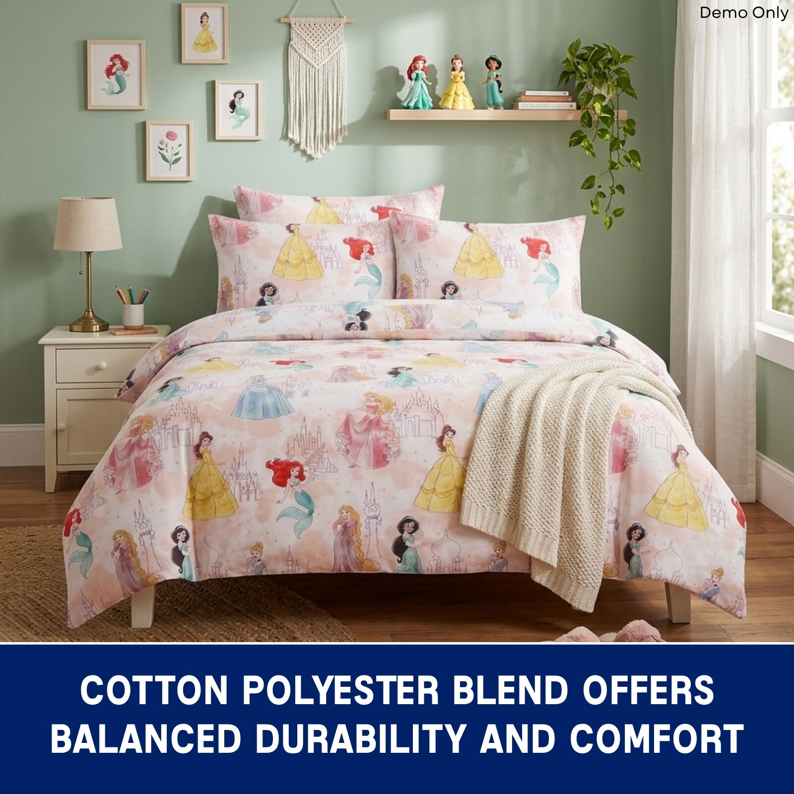 Bring a touch of magic to your child’s bedroom with this Disney Princesses Pink Licensed Quilt Cover Set. Designed to delight, it features beloved Disney princesses in vibrant hues of blue, green, yellow, brown, black, white, pink, and purple, creating a fun and enchanting atmosphere your little one will love. Crafted from a soft-touch polyester cotton fabric, it offers a comfortable and cosy feel for a restful night’s sleep while remaining durable for everyday use. With its easy-care properties, this quilt cover set is simple to maintain, making it a practical choice for busy households while keeping the bedroom looking bright, cheerful, and beautifully themed for years to come.