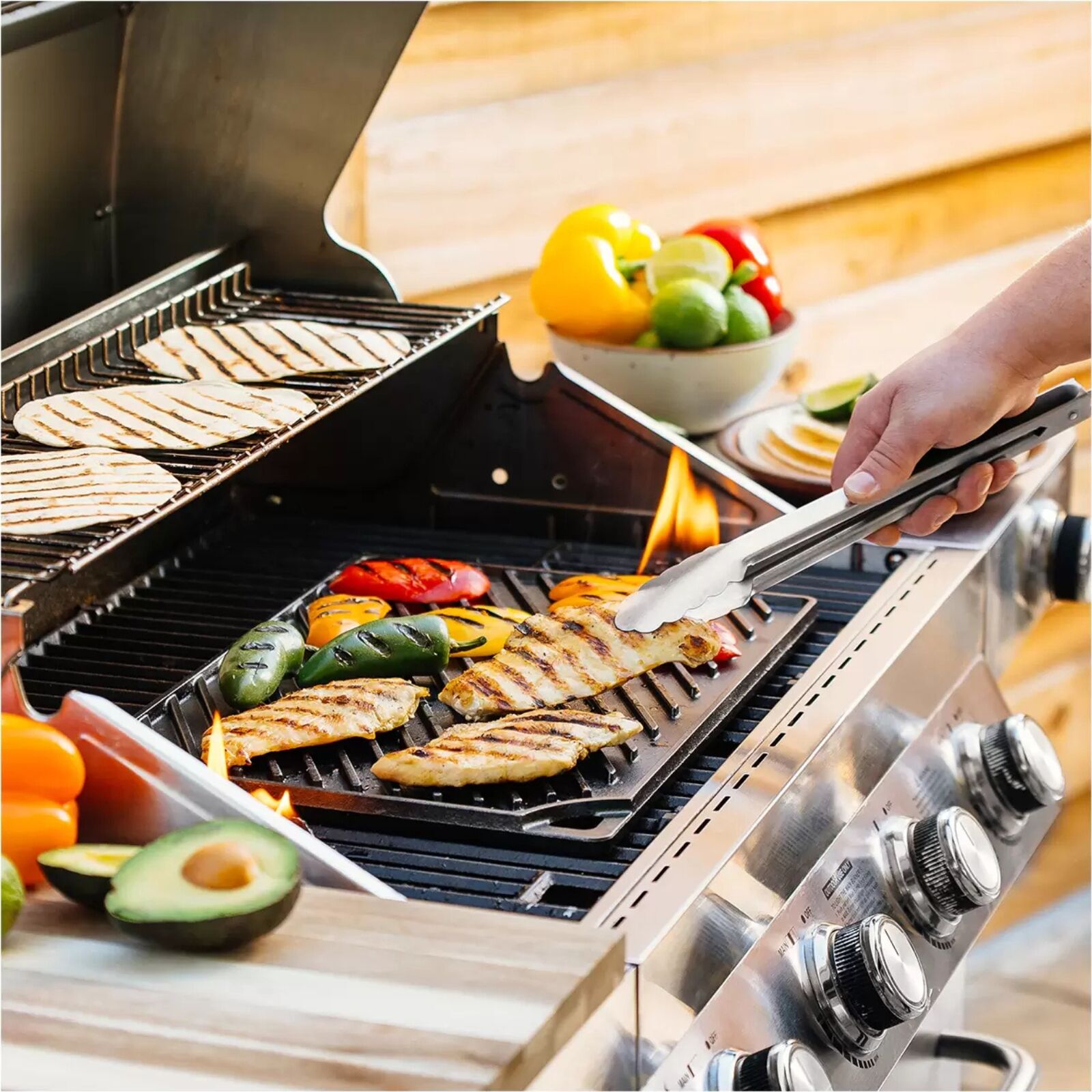 Grill side for burgers, steaks and veggies; smooth griddle side for eggs, pancakes and sandwiches.