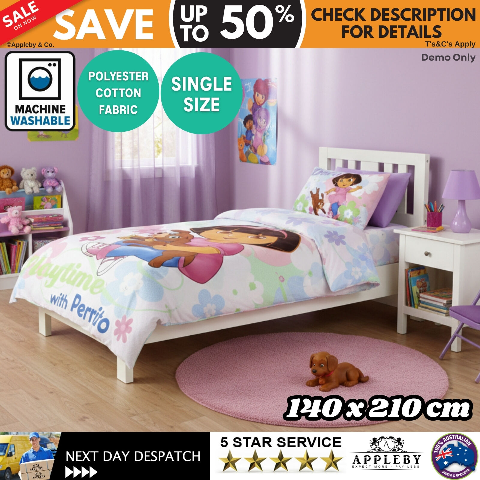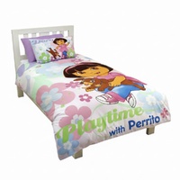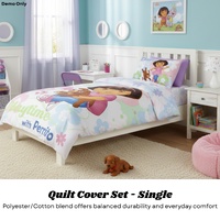 Create a fun and engaging bedroom space with this Dora The Explorer Quilt Cover Set. Featuring a playful Dora The Explorer print set across three different adventure-themed designs, it adds colour and character to your child’s bedroom. The vibrant colour tones help bring the design to life while complementing kids’ room décor. Made from a soft-touch polyester and cotton blend, the fabric provides everyday comfort and is suitable for regular use. Designed to fit a standard single bed, this quilt cover set is a practical and themed bedding option for young Dora fans.