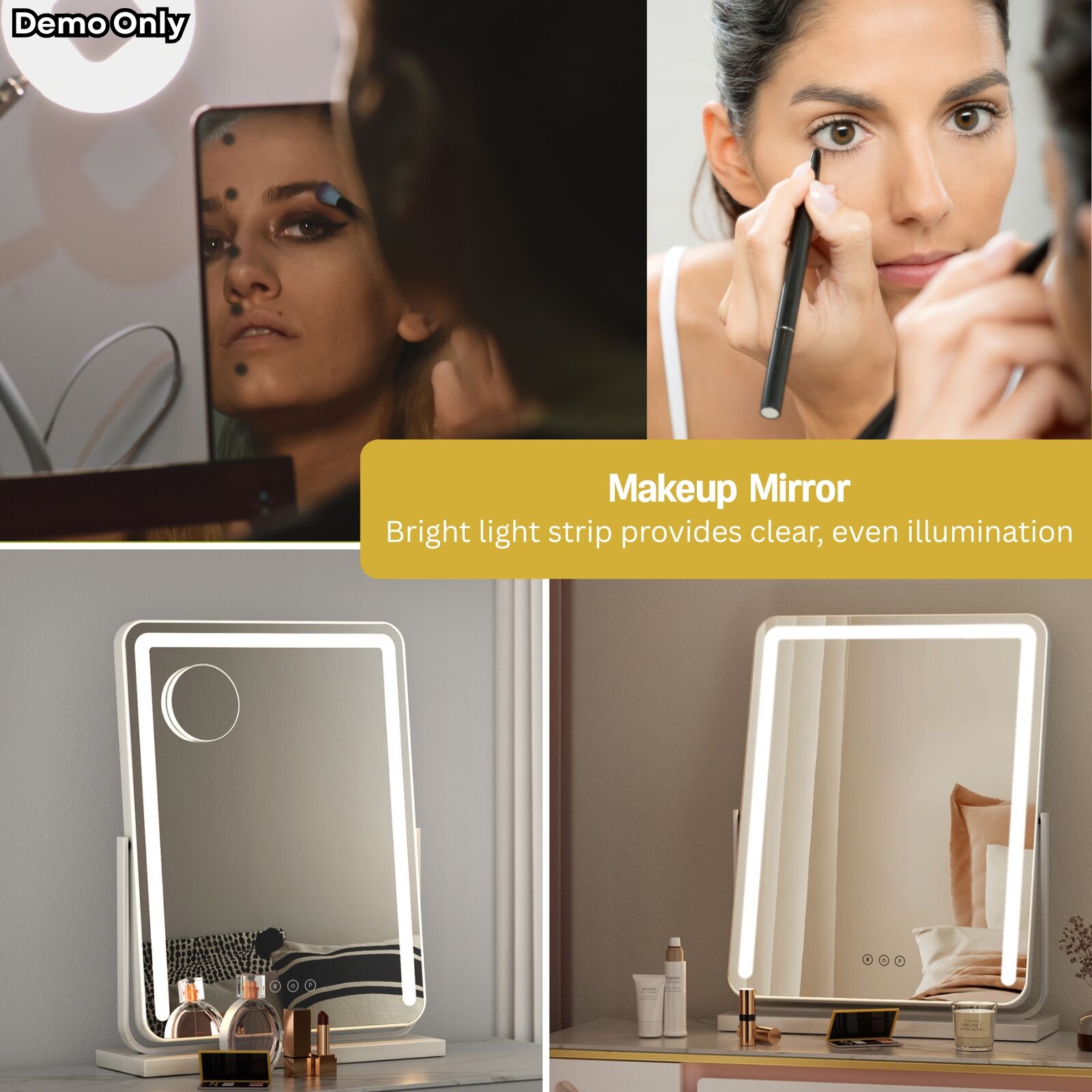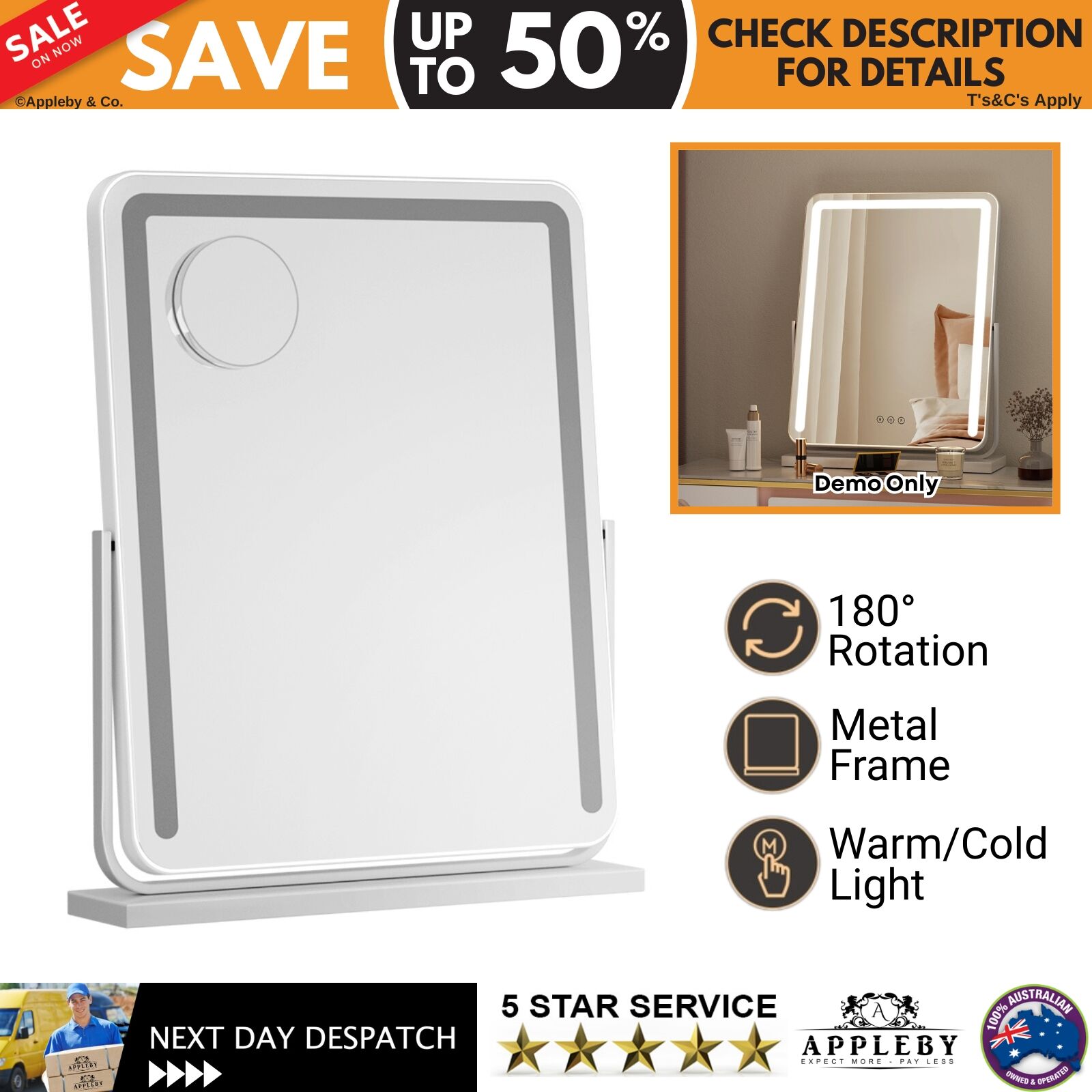 This Hollywood Vanity Mirror provides clear, consistent illumination through its bright LED light strip, helping users apply makeup with improved visibility. The aluminium frame is lightweight yet sturdy, and it sits securely on a powder-coated MDF base that offers stable support. A 180° rotation feature allows the mirror to be positioned at an optimal angle, while touch controls make it easy to adjust both brightness and colour temperature to suit different environments. The adjustable LED lighting helps users achieve accurate colour matching, and SAA-approved components provide added safety assurance. Overall, the mirror’s combination of stable construction, adjustable lighting, and simple controls supports a precise and convenient makeup routine.