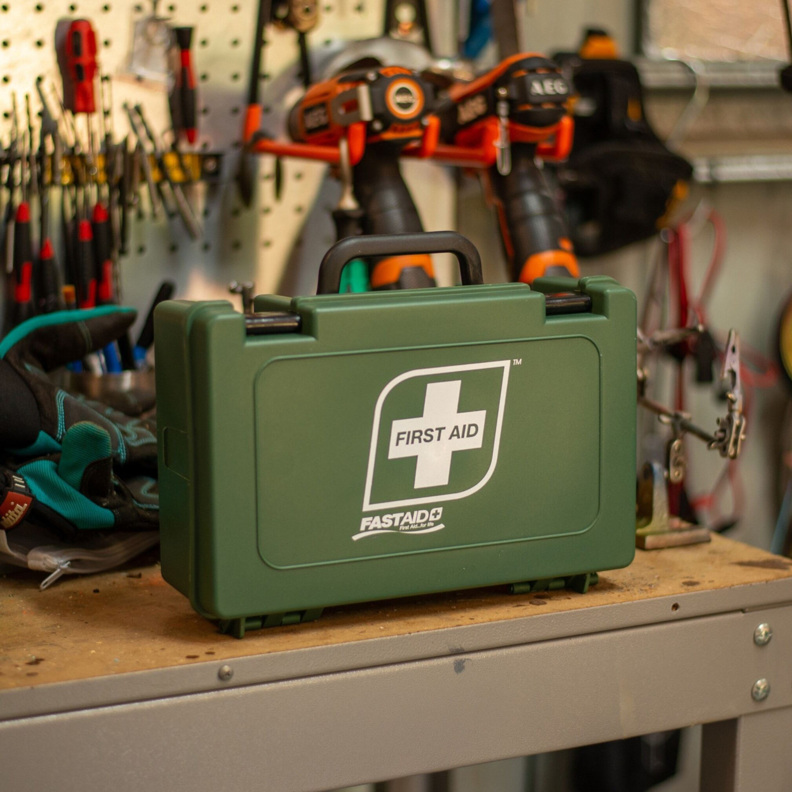 The heavy-duty, dust-proof plastic case is built to handle tough workshop environments while remaining compact and highly portable. A sturdy carry handle makes it easy to transport wherever you need it. Inside, a colour-coded emergency first aid guide provides clear instructions for fast and effective response.