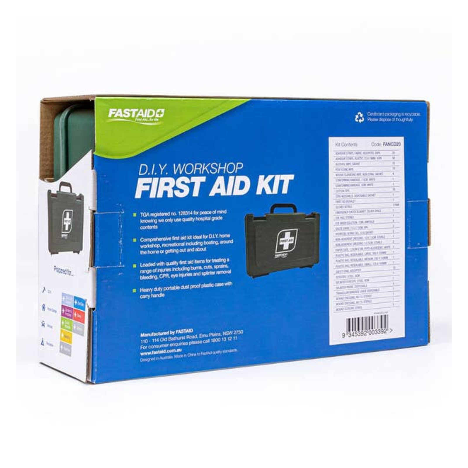 Be prepared for life’s unexpected moments with the FastAid DIY Workshop™ 166 Piece Portable First Aid Kit – FANCD20. Designed specifically for home workshops, garages, boating trips, fishing adventures and everyday household use, this comprehensive kit ensures you’re ready to respond quickly and confidently to a wide range of injuries.