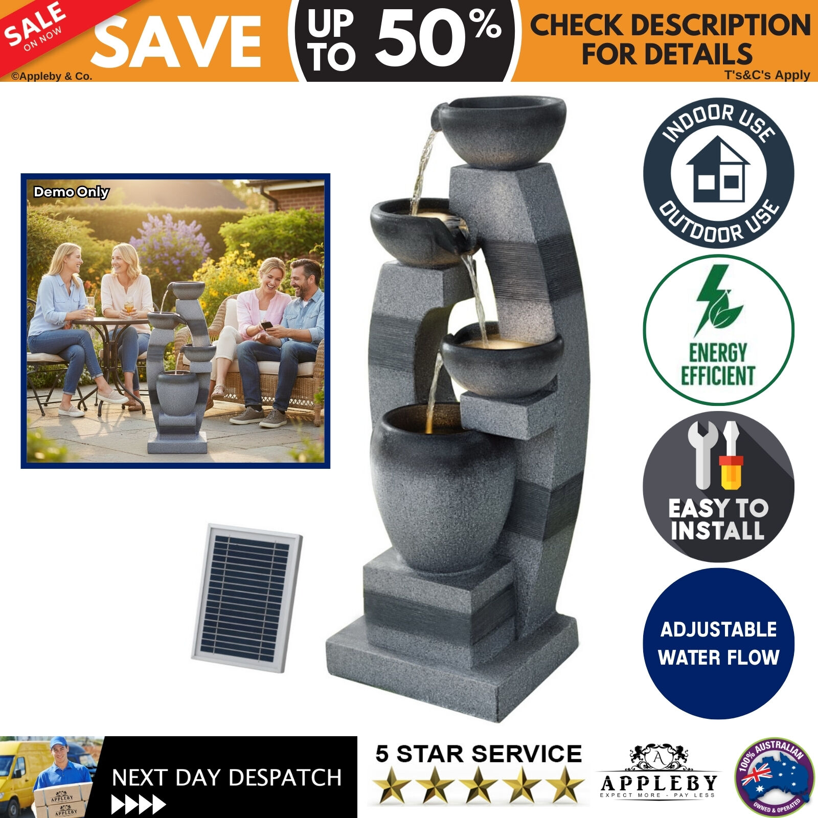 - 4-tier cascading fountain creates continuous multi-level water flow