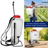 Spring is the perfect time to refresh your backyard, and this 15 Litre Backpack Weed Sprayer helps you get every task done with ease. Designed for comfortable mobility, this backpack-style sprayer features a generous 15L tank that reduces refills and keeps you moving efficiently. The self-priming pump delivers up to 145psi, providing strong, consistent pressure for watering, fertilising, applying herbicides and pesticides, livestock care, or general cleaning around the home. Its 76cm stainless steel lance can be operated with either hand and offers simple pressure control for different applications. The sprayer features four interchangeable nozzles, a fan, and a 4-hole conical and double nozzle, providing the right spray pattern for every job. A built-in trigger lock helps prevent accidental spraying, while the wide 17cm opening and integrated strainer make filling quick and clean, sealed securely by the anti-spill lid. Compact, portable and easy to operate.