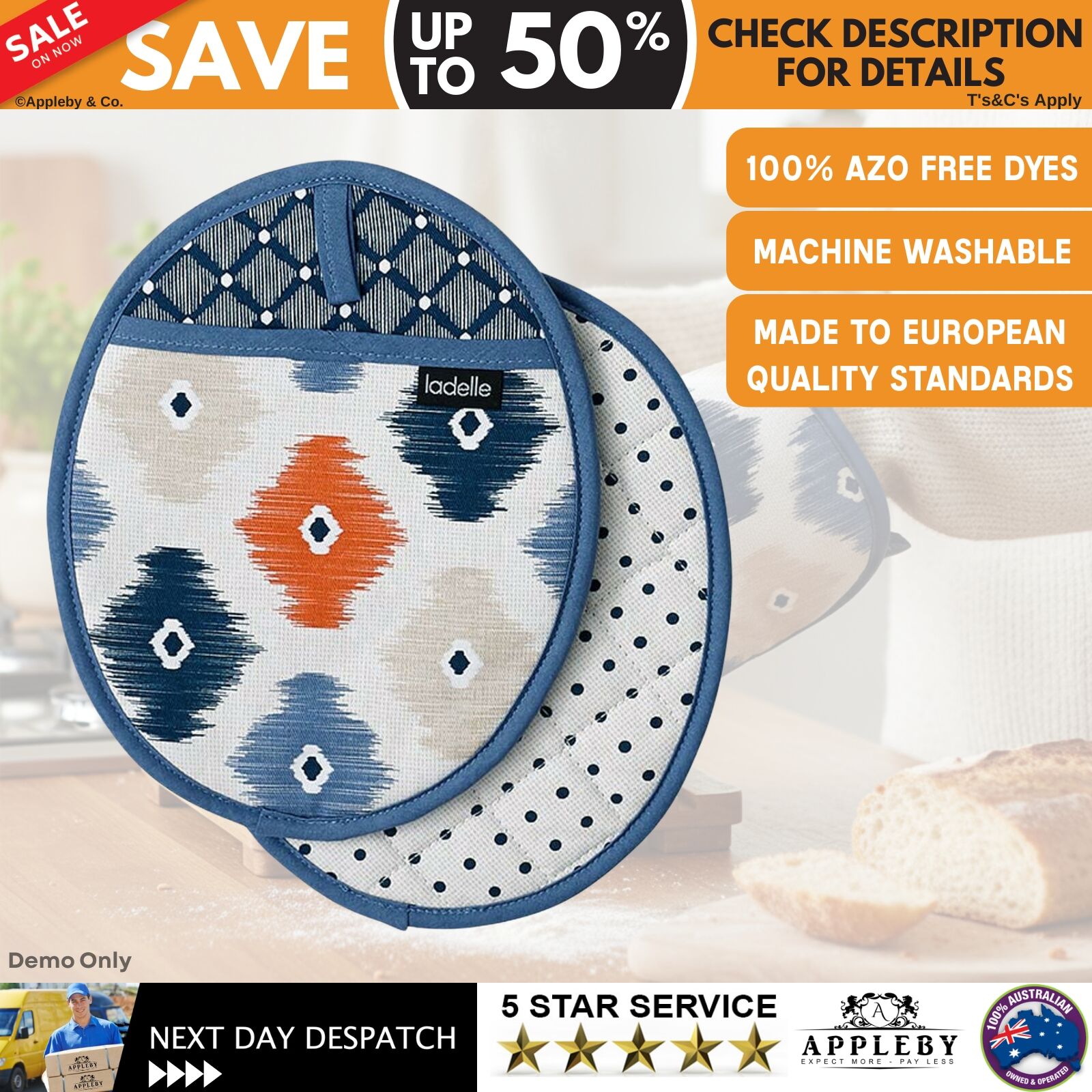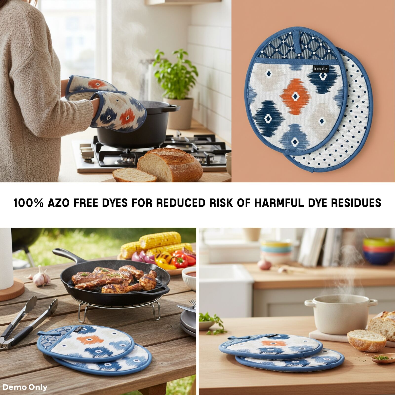 Add both style and practicality to your kitchen or BBQ setup with this Cotton Pot Holders. Designed to inspire enjoyable cooking moments, these pot holders feature a quilted mosaic artwork in soothing tones of Indigo, Taupe, Coral, White, and Navy, bringing a fresh pop of colour to any kitchen décor. Crafted from durable, easy-care 100% cotton, they provide reliable heat protection while remaining comfortable to handle and simple to maintain. Made using 100% AZO free dyes and to European quality standards, these pot holders offer a safe, dependable, and stylish solution for everyday cooking and outdoor BBQ use.